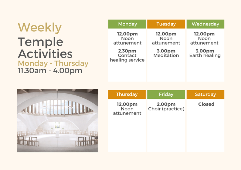 Activities in the Temple of Light include regular services of worship, healing and meditation sessions. Two smaller chapels are used by healing groups.